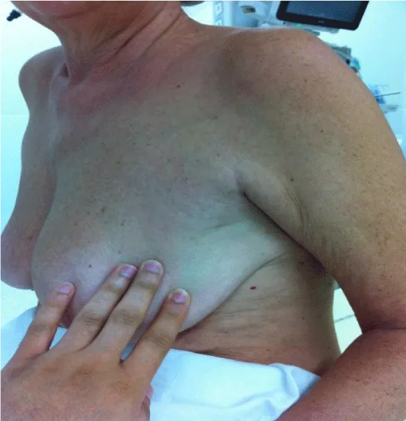 A 57-year-old Caucasian woman presented to our clinic with a palpable mass in the axillary tail of her left breast it had been growing progressively for 4 months, with no other associated symptoms. This patient had no family history of breast cancer, nor anything particular to this case in her medical history. Upon physical examination of the left breast, a 2 cm mass was palpable at 2 o’clock, tethered to the overlying skin (Figure 1). The mass was immobile, firmly attached to the skin and underlying tissue, and was not tender to the touch. The left nipple was not retracted, and there was no apparent discharge. There were no palpable axillary lymph nodes.