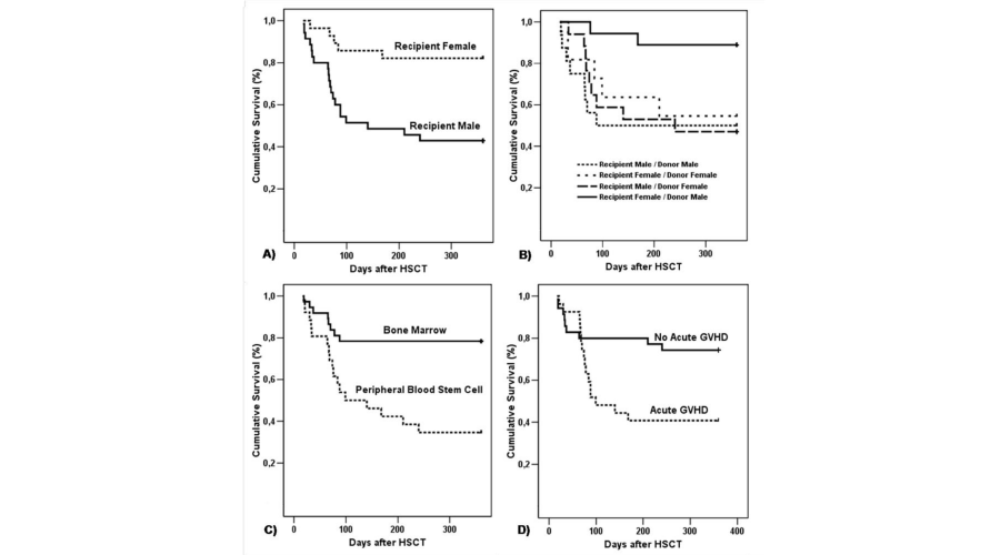 In the present study we evaluated the impact of recipient gender, patient/donor gender, stem cell source, aGVHD and cytokine levels on allo-HSCT survival. Previous studies have shown that recipient and/or donor gender can affect recipient survival [15, 16]. Male patients demonstrated an increased risk of death after allo-HSCT relative to female patients. In addition, a male donor with a female recipient was associated with reduced risk of death after allo-HSCT. One possible explanation is the microchimerism, which consists on the presence of circulating donor and recipient hematopoietic cells. Studies showed that the male donor cells may initiate GVHD [15,17]. In agreement with the European Group for Blood and Marrow Transplantation, male recipients with female donors presented the worst outcome after HSCT, relative to all other donor-recipient gender combinations [12]. In another study, female donors were associated with an increased risk of patient death [18].