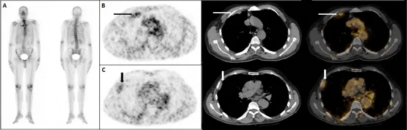 A 72-Year-Old man with newly diagnosed prostate cancer (PSA:12.47ng/ml, Gleason score:3+3) underwent skeletal scintigraphy before treatment. Suspicious Tc-99m MDP uptake was seen on right hemithorax (Figure 1A). Due to suspicious Tc-99m MDP uptake on right hemithorax on bone scintigraphy, further investigation using 68Ga-PSMA PET/CT was suggested. 68Ga-PSMA PET/CT revealed increased heterogeneous uptake in the right posterolateral segment of prostate gland compatible with prostate needle biopsy findings (adenocarcinoma). 68Ga-PSMA PET/CT images showed non-expected slightly increased uptake (SUVmax:1.6) in the right hemithorax greater than mediastinal blood pool activity (SUVmax:1.2), corresponding to pleural thickening seen on the CT images (first intercostals space (Figure 1B) and neighbourhood of the 4 and 6 rib (Figure 1C) with normal lung parenchyma. Thoracoscopic biopsy was performed to establish a definitive diagnosis. The results of histopathological examination (excisional biopsy) indicated the features of chronic inflammation with focal mesothelial hyperplasia. There was no evidence of stromal invasion.
