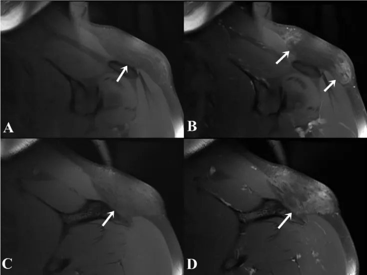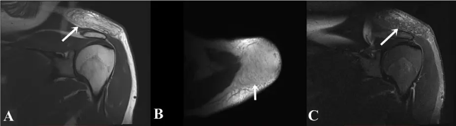 A 35-year-old male patient admitted to hospital with the mass growth on the left shoulder within 1 year. The patient complained of pain spreading from the lesion location to the left arm for the last 3 months. Physical examination revealed a rubbery and fixed lesion within 8x7 cm diameter on the left shoulder. A mild erythema was established on the skin without any varicose dilatation. US examination showed a large heterogeneous isoechoic lesion according to fatty tissue in the subcutaneous location. The solid lesion was in distinguishable from the adjacent muscle-fatty plans. MRI study revealed a solid lesion on the left shoulder within 27x68x92 mm diameter that had heterogeneous isoechoic character according to the fatty tissue on both T1- and T2-weighted imaging and fat suppressed technique showed suppression. The lesion had band shaped hypointense content. After the contrast material administration, fat saturated T1-weighted imaging demonstrated band shaped hypointense areas within the lesion were enhanced. The borders of the lesion were indistinguishable from normal fatty tissue in some regions (Figures 1,2). No evidence of any lesion was found in the adjacent bone tissue. The preliminary diagnosis of liposarcoma was considered after the imaging findings. The patient was operated under general anesthesia. In surgery, the lesion had no capsule and the borders were unable to separate from the surrounding fatty tissue. The mass with adjacent normal fatty tissue within 4x8x10 cm area were wide excised. The skin was primary sutured and closed. Pathological examination result was uncapsuled fibrolipoma. The lesion weight was 928 gram. At follow-up, there was no evidence of residual-recurrence in the US control at the 6 months and patient complaints disappeared.