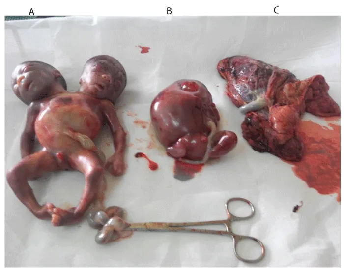 MS, 32 years old now P4+1, a woman who has caesarian section for conjoined twin (thoracopagus) and malformed triplet on 26/3/15 at ultrasound gestational age of 21weeks. She registered for antenatal care on 19/03/15 one week prior to delivery at gestational age of about 20 weeks with LMP(Last Menstrual Period) 2/11/14 with a booking Packed Cell volume of 38%, blood group A+ve, genotype AA, RVD(Retro-viral diseases) negative, booking BP 110/60mmHg and normal urinalysis. Pregnancy was spontaneously conceived. She is not known as hypertensive or diabetic, no history of teratogenic drugs usage or herbs used and no history of viral infection in index pregnancy. All previous deliveries were SVD (Spontaneous Vaginal Delivery) all alive and well.